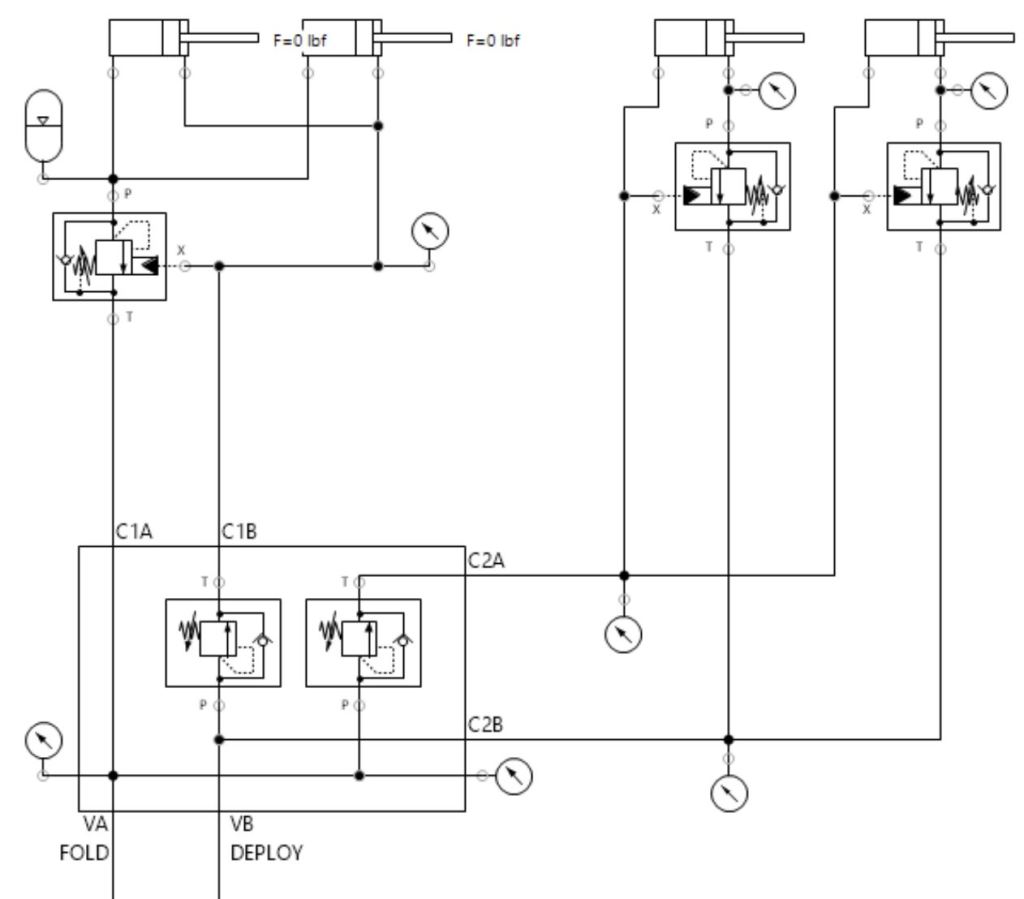 To begin, I studied relevant texts in the field of hydraulic actuation and control, and tapped into my professional network of experts on the subject. I used this guidance to create a fully passive, fail-safe, sequenced hydraulic circuit with one-lever actuation to coordinate movement of multiple actuators.