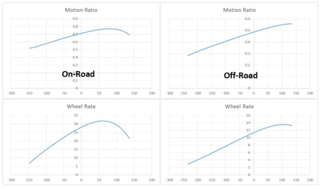 Analysis showed that by replacing the original suspension component with one of the adjustable design, the existing car could be adjusted from its on-road optimized original form to an off-road optimized configuration. In the off-road configuration, wheel travel was increased by nearly 65%. The geometry retained a progressive motion ratio, a suspension sag of approximately 40%, and a ride height increase of 6mm.