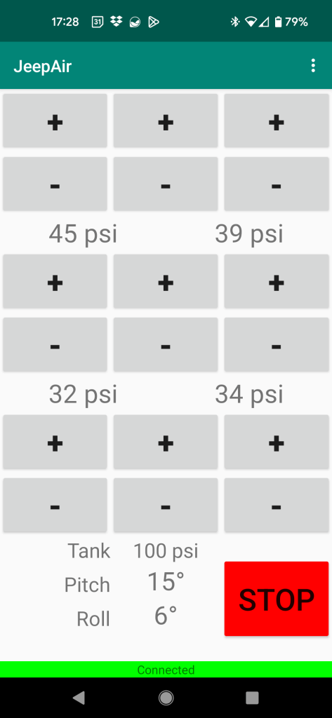 I coded an Arduino program to live on the Jeep, which was relatively easy given my existing Arduino experience. I then taught myself to create Android applications and to use the phone’s Bluetooth radio to communicate with the Arduino and independently control the height of each suspension corner, as well as air compressor functions.